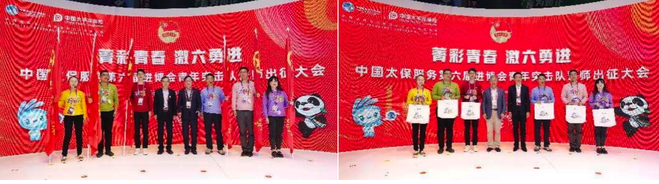 来自中国太保集团、中国太保产险、中国太保寿险、太平洋健康险、太保科技和派驻进博局团队的六支服务第六届进博会青年突击队现场接受检阅。孔庆伟、傅帆代表中国太保集团党委为青年突击队授旗,全体志愿者庄严宣誓:“中国太保,激六勇进;全心服务,圆满进博!”。