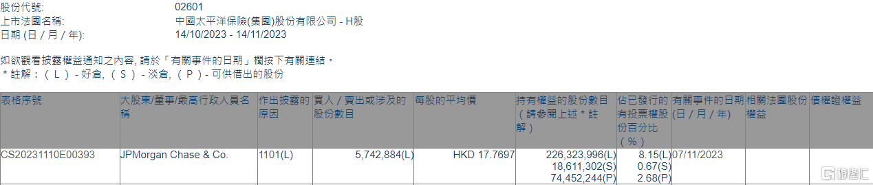 格隆汇11月14日丨根据联交所最新权益披露资料显示,2023年11月7日,中国太保(02601.HK)获JPMorgan Chase & Co.以每股均价17.7697港元增持好仓574.29万股,涉资约1.02亿港元。