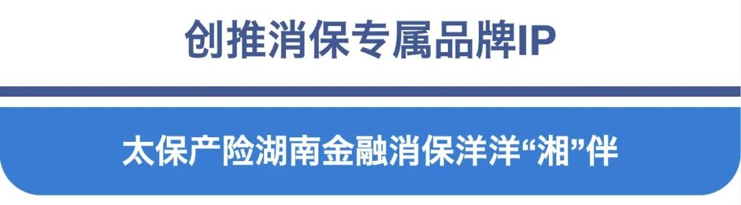 中国太保产险湖南分公司面对新时期新消保工作的新要求,认真履行金融消费者权益保护主体责任,将消费者权益保护作为防风险、促民生的有力抓手,聚焦消费者关注点,积极运用“互联网+”思维与“广电+”渠道,面向社会公众推出《洋洋“湘”伴》专属消保品牌IP,立足于金融消费者实际需要,致力于打造常态化、阵地化金融教育标杆,成为扩大消费者触达、有效整合各类资源的创新探索。
