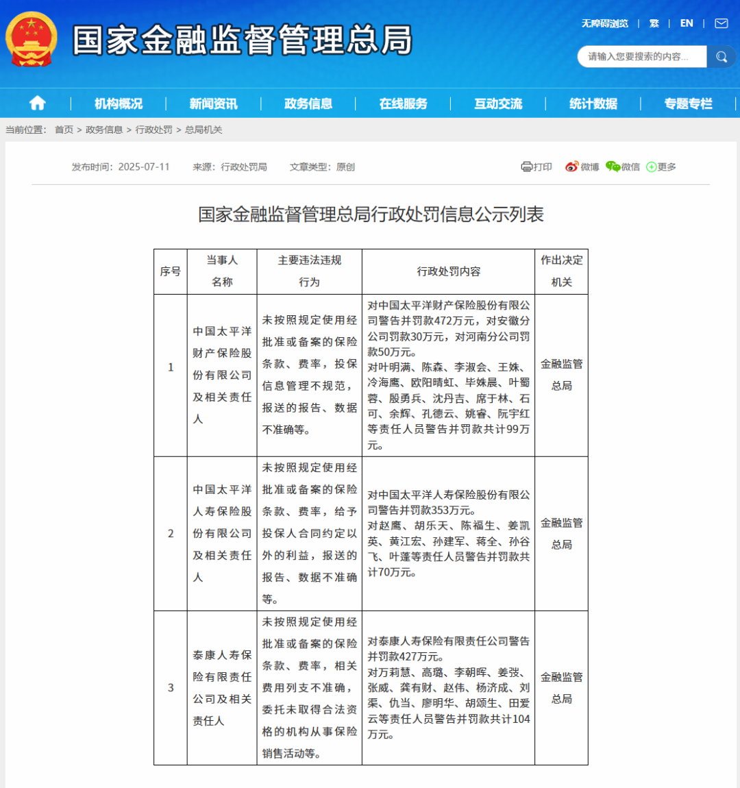 同日,旗下寿险公司亦被列在了罚款名单之中。因未按照规定使用经批准或备案的保险条款、费率,给予投保人合同约定以外的利益,报送的报告、数据不准确,太保寿险被警告并罚款353万元。与此同时,监管总局对赵鹰、胡乐天、陈福生、姜凯英、黄江宏、孙建军、蒋全、孙谷飞、叶蓬等责任人员警告并罚款共计70万元。两案叠加,罚没金额高达1074万元,创下年内险企被罚新高。