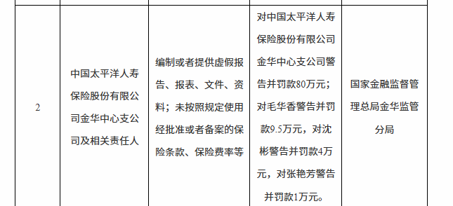 进入8月,监管“余波”仍未平息。8月8月,金华监管分局披露,太保寿险金华中心支公司及相关责任人因编制或者提供虚假报告、报表、文件、资料;未按照规定使用经批准或者备案的保险条款、保险费率等,被警告并罚款80万元;对毛华香警告并罚款9.5万元,对沈彬警告并罚款4万元,对张艳芳警告并罚款1万元。