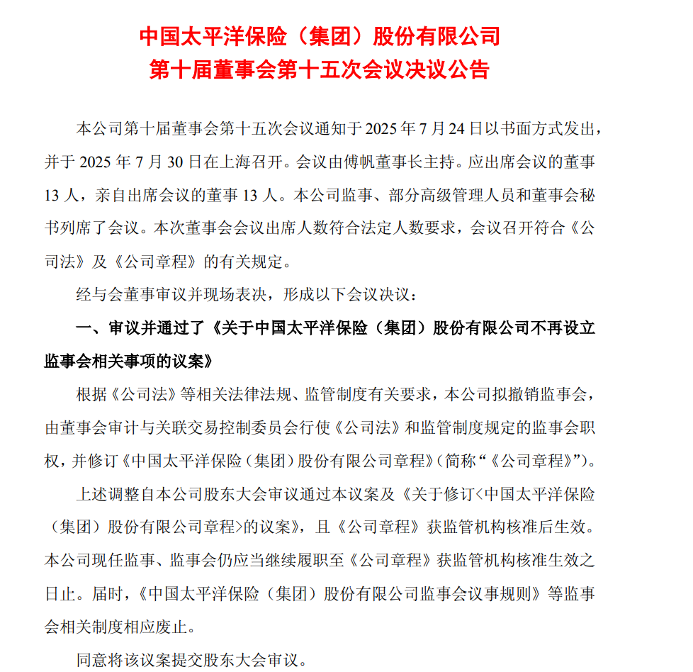7月30日,中国太平洋保险(集团)股份有限公司(下称“中国太保”)召开第十届董事会第十五次会议,审议并通过了《关于中国太保不再设立监事会相关事项的议案》。