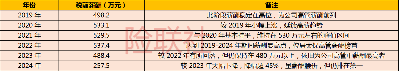 既然贡献大,薪水自然也不低,而且长期是太保高管里最高的。