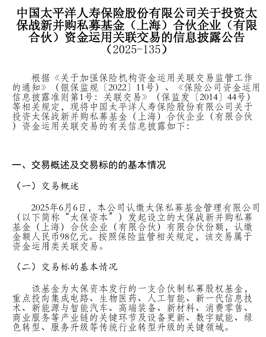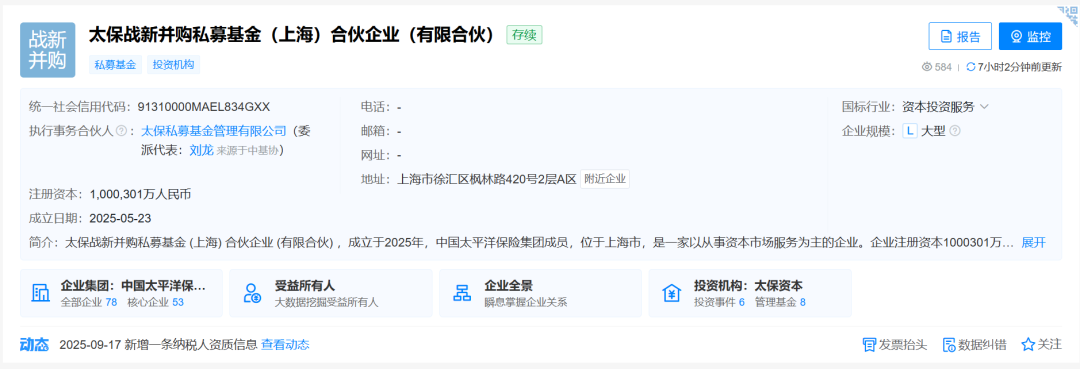 2025年5月23日,太保战新并购私募基金(上海)合伙企业(有限合伙)成立,由中国太平洋人寿保险股份有限公司发起设立的私募基金管理机构,注册资本为1000301万元人民币。