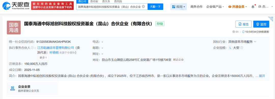 11月5日,中国太保、中际旭创等企业共同发起设立国泰海通中际旭创科技股权投资基金(昆山)合伙企业(有限合伙),出资额15亿元。