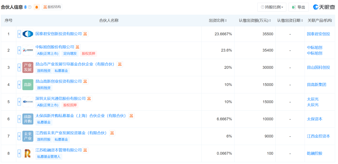 资料显示,该基金由国泰君安创新投资担任执行事务合伙人,其他出资方还包括:国泰海通旗下国泰君安创新投资有限公司、中际旭创、中国太保旗下太保战新并购私募基金合伙企业以及太辰光等8家公司为该基金出资方。该基金将主要开展以私募基金从事股权投资、投资管理、资产管理等活动。