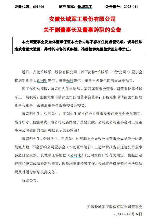 5日盘后,长城军工公告称,董事会收到副董事长蒋宗明、董事张胜、董事王强的书面辞职报告。因工作变动原因,蒋宗明申请辞去第四届董事会董事、副董事长等长城军工一切职务;张胜申请辞去第四届董事会董事;王强申请辞去第四届董事会董事、第四届董事会战略委员会委员。