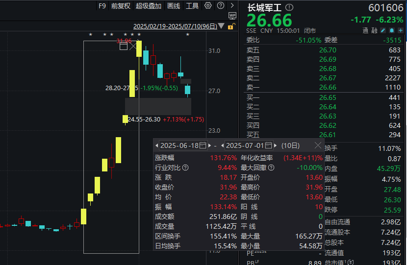 《每日经济新闻》记者注意到,长城军工是近期A股市场的焦点个股,Wind金融终端数据显示,6月18日~7月1日,长城军工在10个交易日内收获8个涨停板,期间累计涨幅达131.76%,远超同期国防军工行业指数9.25%和上证指数2.08%的累计涨幅。