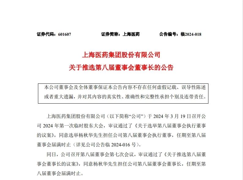 2024年3月19日晚间,上海医药披露两则高层人事变动的信息,新推选杨秋华为上海医药第八届董事会董事长。同日,原来代为履职的姚嘉勇辞去公司董事、副董事长等全部职务,辞任后不在上海医药及下属企业担任任何职务。四个月前接受审查调查的原董事长周军已于日前被“双开”。
