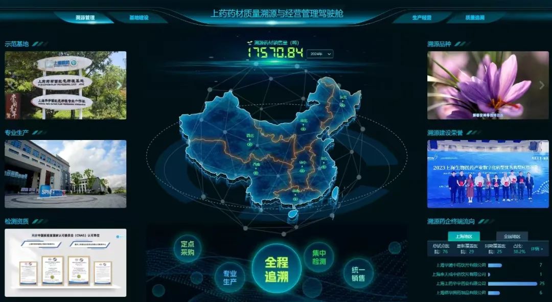 上药药材积极响应推动中医药事业和产业高质量发展的国家战略,结合中药行业特点和企业发展需求,以“数字赋能的中药饮片高质量全流程追溯体系构建与应用”为课题,聚焦中药全产业链溯源体系建设,将区块链、5G、大数据等最新技术与传统产业深度结合,探索并构建“互联网+数智化+中医药”的高质量发展新模式,形成从“中药材选种、育种、种植到饮片生产、加工、使用、配送”的全程闭环式标准化管理,打造出具有行业示范性的中药全产业链追溯平台,实现了“从田头到口头”的数字化场景展示。