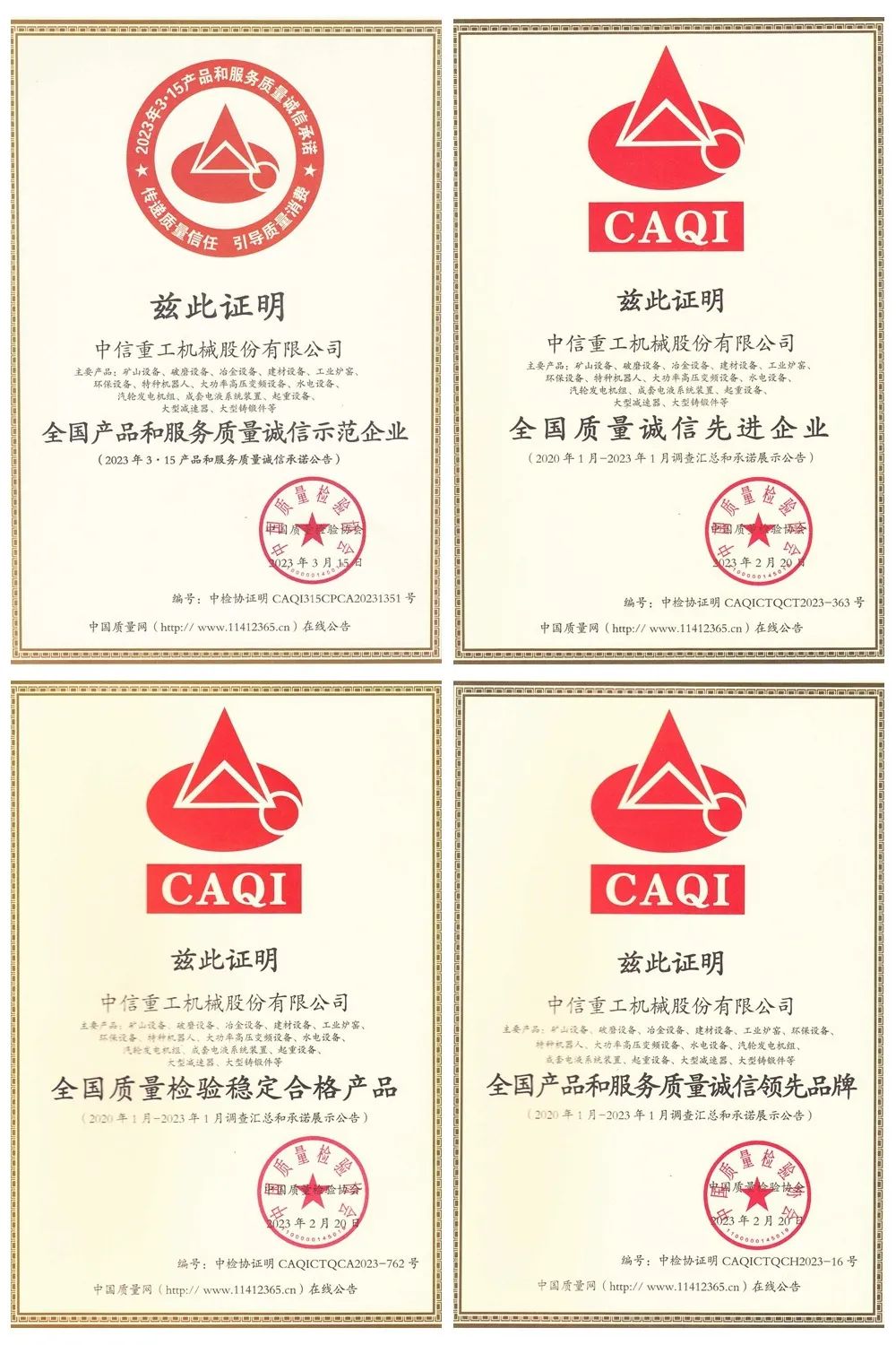 近日,中信重工凭借过硬的品质、优质的服务、良好的品牌形象,再次获得中国质检协会授予的“全国质量诚信先进企业”、“全国产品和服务质量诚信领先品牌”、“全国质量检验稳定合格产品”、“全国产品和服务质量诚信示范企业”四项荣誉。