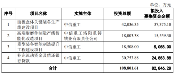 中信重工2023年7月1日发布向特定对象发行股票募集说明书(修订稿),公司本次向特定对象发行股票的募集资金总额不超过82,846.28万元(含82,846.28 万元),扣除发行费用后,拟全部用于面板盒体关键装备生产线建设项目、高端耐磨件制造产线智能化改造项目、重型装备智能制造提升工程建设项目、补充流动资金及偿还银行贷款。