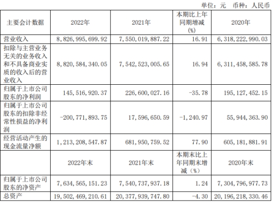 中信重工2022年营业收入为88.27亿元,同比增长16.91%;归属于上市公司股东的净利润为1.46亿元,同比下降35.78%;归属于上市公司股东的扣除非经常性损益的净利润为-2.01亿元,上年同期为1759.67万元;经营活动产生的现金流量净额为12.13亿元,同比增加77.90%。