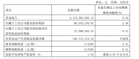 中信重工2023年第一季度营业收入为21.72亿元,同比增长0.30%;归属于上市公司股东的净利润为8007.03万元,同比增长2.46%;归属于上市公司股东的扣除非经常性损益的净利润为3768.87万元,同比下降9.41%;经营活动产生的现金流量净额为-1.07亿元。