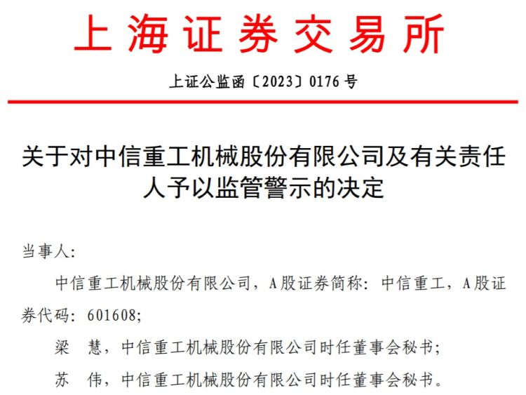 上交所官网9月19日信息显示,因未及时履行审议程序,9月18日,中信重工(601608)及时任董事会秘书梁慧、苏伟被上交所监管警示。