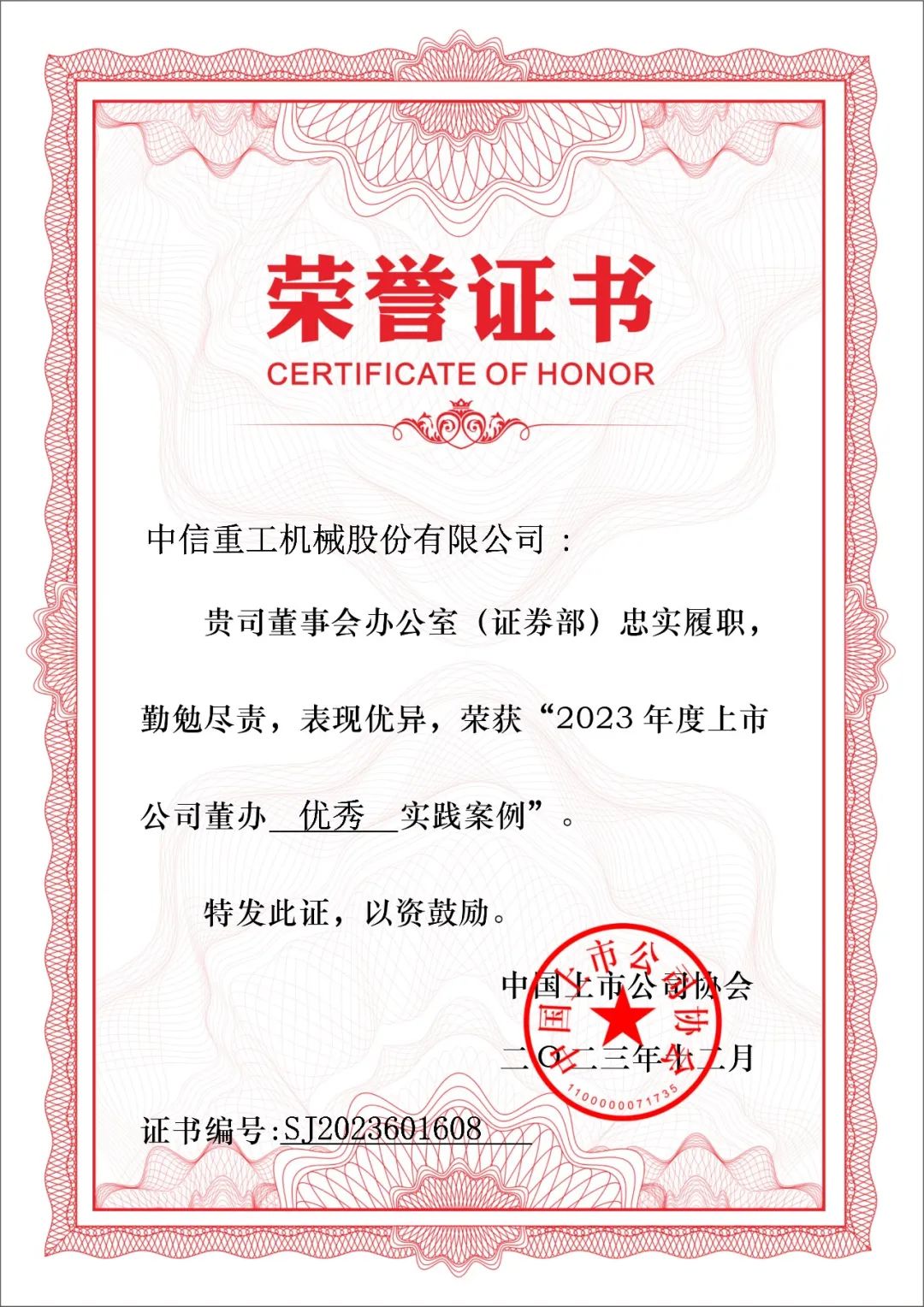 本次获得“2023年度上市公司董办优秀实践案例”荣誉,是中国上市公司协会对中信重工董办在评价期内合规治理的经营理念,为公司、投资者、股东创造价值等方面优异表现的充分肯定,进一步体现中信重工规范运作、勇于创新的良好形象。
