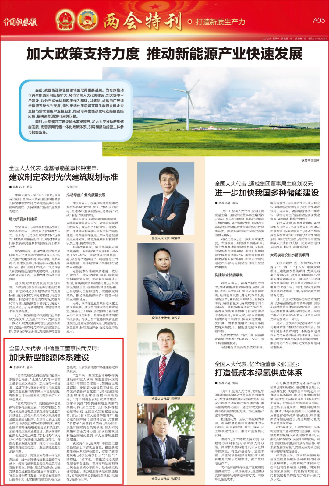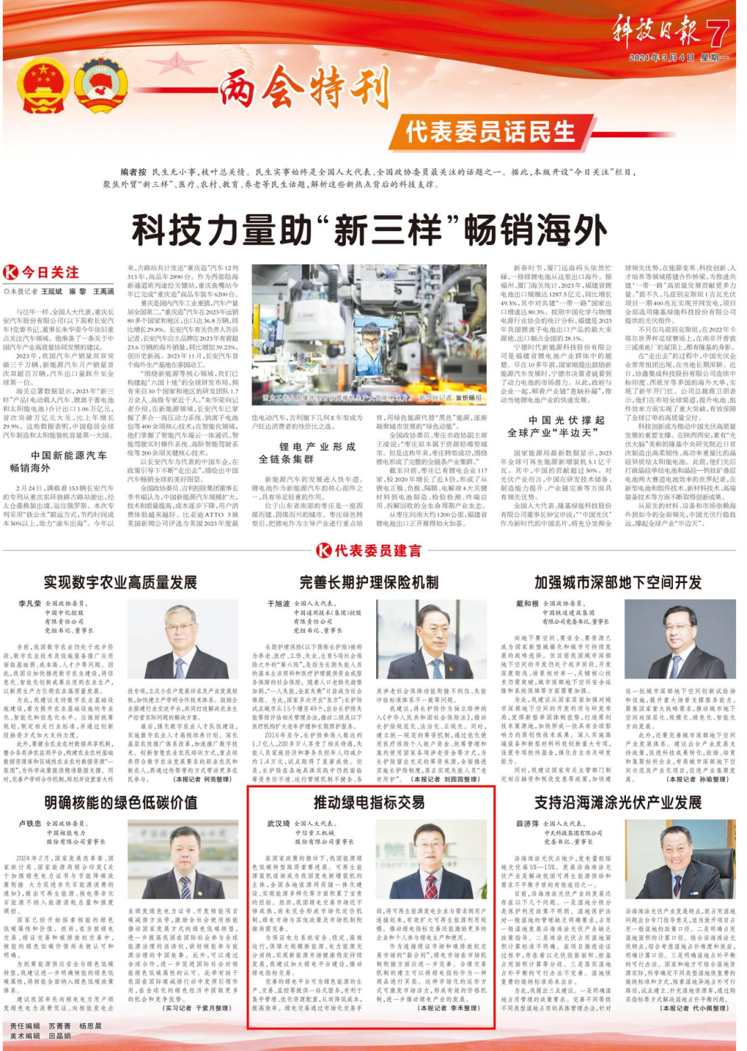 “清洁低碳安全高效是现代能源体系的核心内涵。”全国人大代表、中信重工董事长武汉琦建议,加大绿电平台建设,通过市场化交易手段将可再生能源发电企业直接与需求侧用户连接起来,有效推动可再生能源利用的规模扩大和绿色发展。