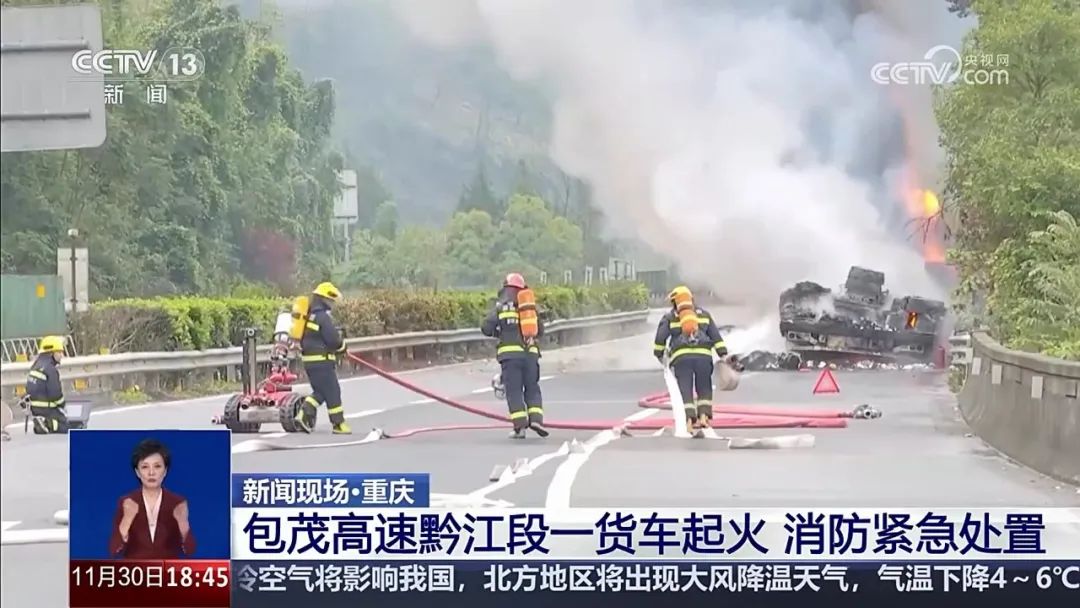 日前,一辆由成都开往广州的货车,行驶至G65包茂高速重庆黔江段时突然起火,整辆货车很快被熊熊大火包围,火势凶猛,浓烟滚滚。