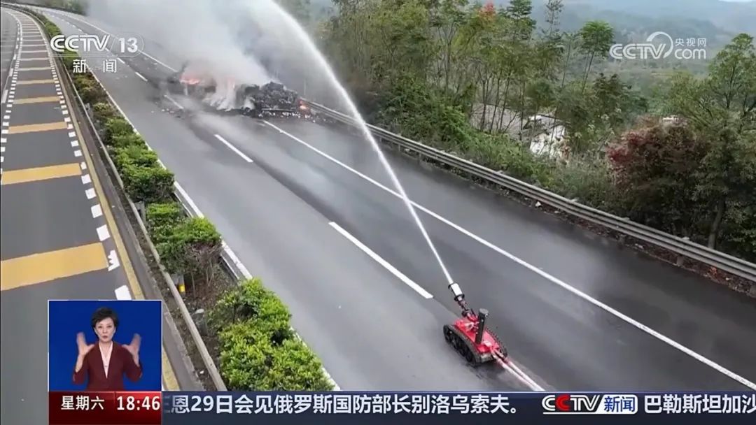 经过一个小时机器人与消防员的紧张扑救,明火被完全扑灭,事故未造成人员伤亡。