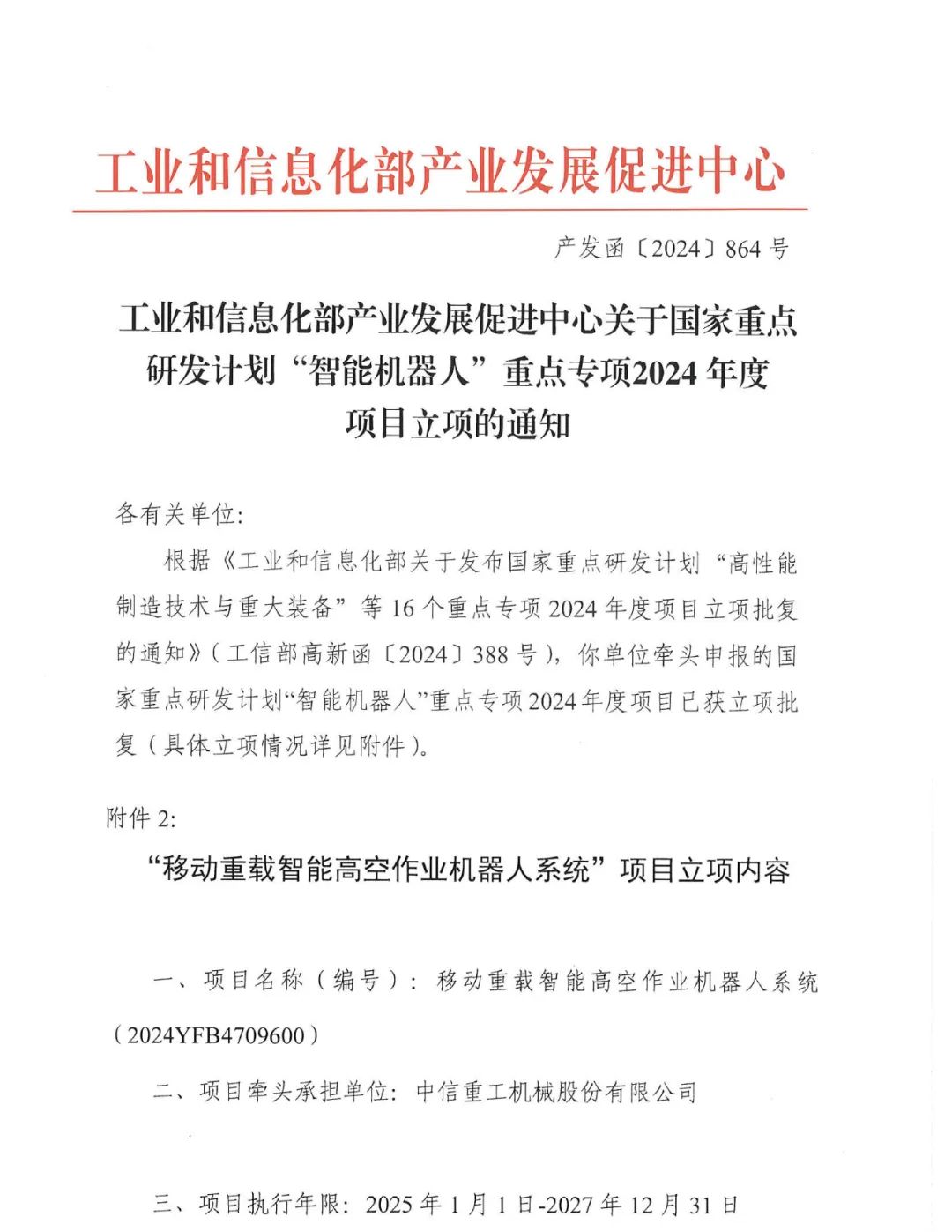 近日,根据工信部通知,由中信重工牵头申报的国家重点研发计划“智能机器人”重点专项“移动重载智能高空作业机器人系统”项目获批立项。这是继2017年和2019年,中信重工牵头承担国家重点研发计划“智能机器人”重点专项之后,中信重工在机器人国家科技计划项目上的又一次突破。