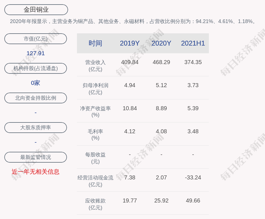 2020年年报显示,金田铜业的主营业务为铜产品、其他业务、永磁材料,占营收比例分别为:94.21%、4.61%、1.18%。