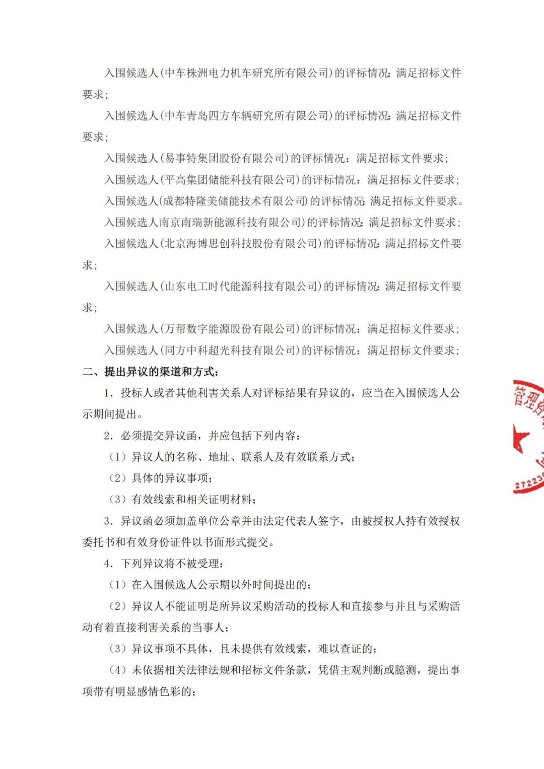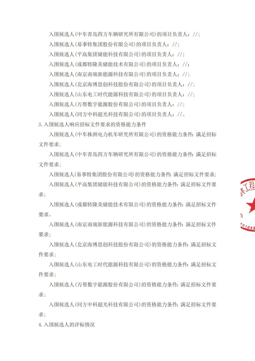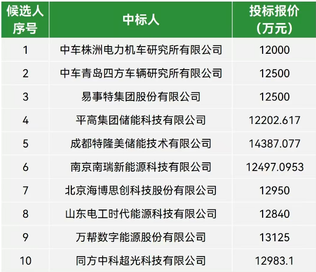 中车株洲电力机车研究所有限公司、中车青岛四方车辆研究所有限公司、易事特集团股份有限公司、平高集团储能科技有限公司、成都特隆美储能技术有限公司、南京南瑞新能源科技有限公司、北京海博思创科技股份有限公司、山东电工时代能源科技有限公司、万帮数字能源股份有限公司、同方中科超光科技有限公司10家企业入围。