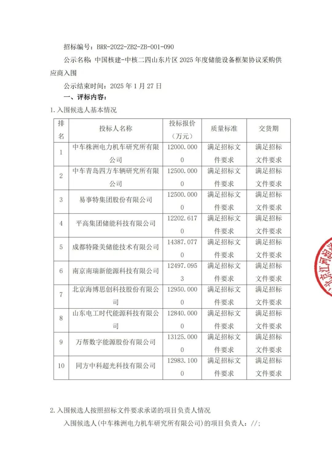 日前,中国核建-中核二四山东片区2025年度储能设备框架协议采购供应商入围中标候选人公示: