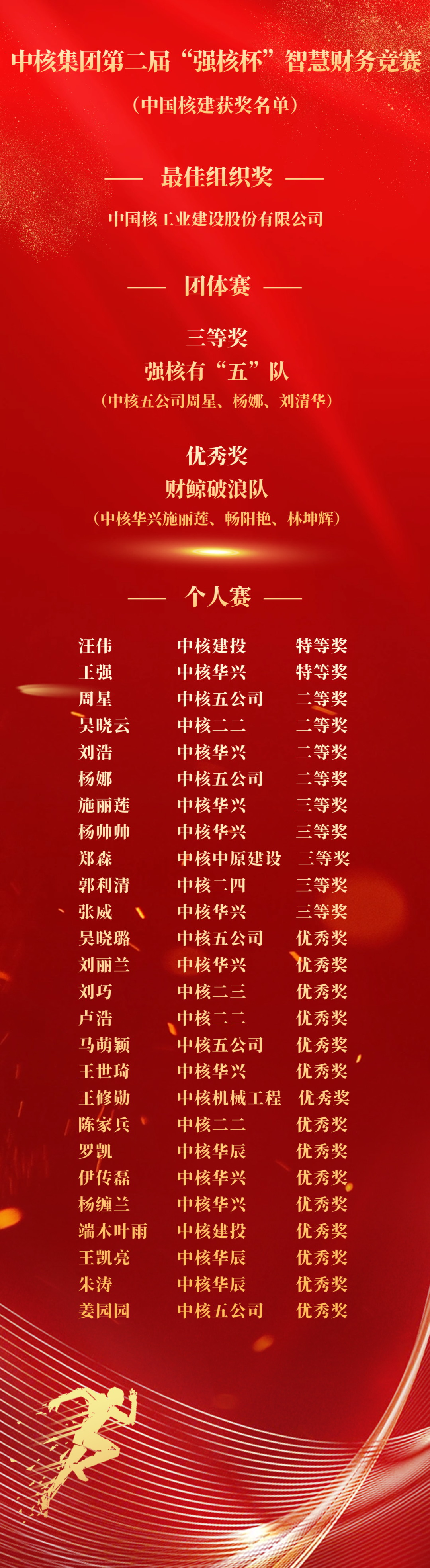 9月19日,集团公司第二届“强核杯”智慧财务竞赛在成都圆满落幕,中国核建斩获28项个人奖和2项团体奖,其中汪伟、王强摘得个人赛特等奖。