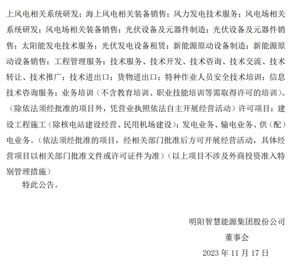 11月17日,明阳智能发布《关于完成工商变更登记的公告》。