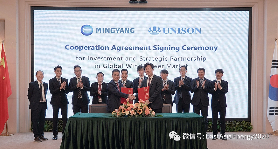 图片说明:韩国本土风电企业Unison于今年5月15日对外公布,公司已与明阳智能签署合作协议,双方将携手打造及构筑韩国本土+海外市场的技术合作及产品竞争力。本次合同协议于5月10日在中国广东省中山市的明阳智能总部签订。去年5月,在Unison及明阳智能之间的战略合作谅解备忘录,经过1年的具体合作协商后,本次的合作协议书由Unison公司总经理Park-wonseo及和明阳智能董事长张传卫作为双方代表正式敲定合作协议。
