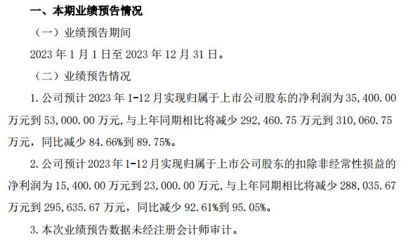 明阳智能1月30日晚间发布2023年年度业绩预告,预计2023年实现归属于上市公司股东的净利润为3.54亿元到5.3亿元,同比减少84.66%到89.75%。
