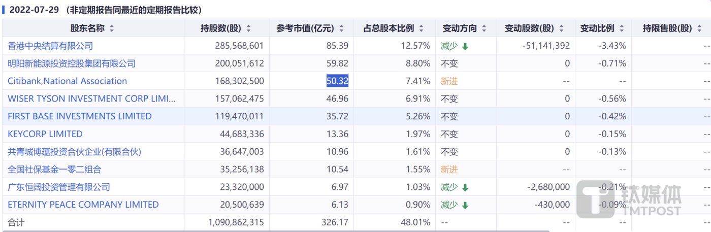 除了上述两名股东之外,公司的第五大股东Citibank,National Association(下称Citibank)也在连续减持。2023年年初,Citibank持有公司7158万股股票,持股比例为3.15%,为公司的第五大股东。