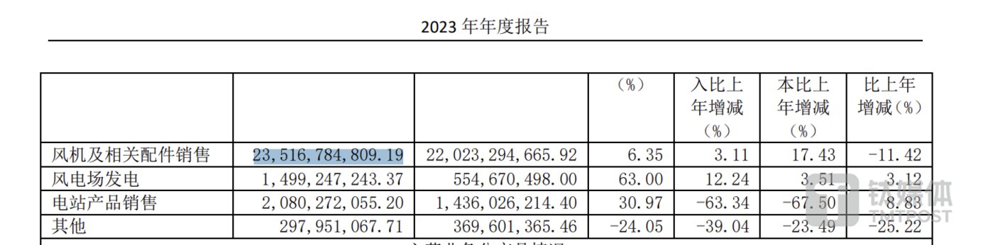 分行业来看,2023年,明阳智能的风机及相关配件销售、风电场发电、电站产品销售收入分别为235.16亿元、14.99亿元、20.8亿元,同比变动幅度为3.11%、12.24%、-63.34%,公司电站产品收入下滑较为严重。