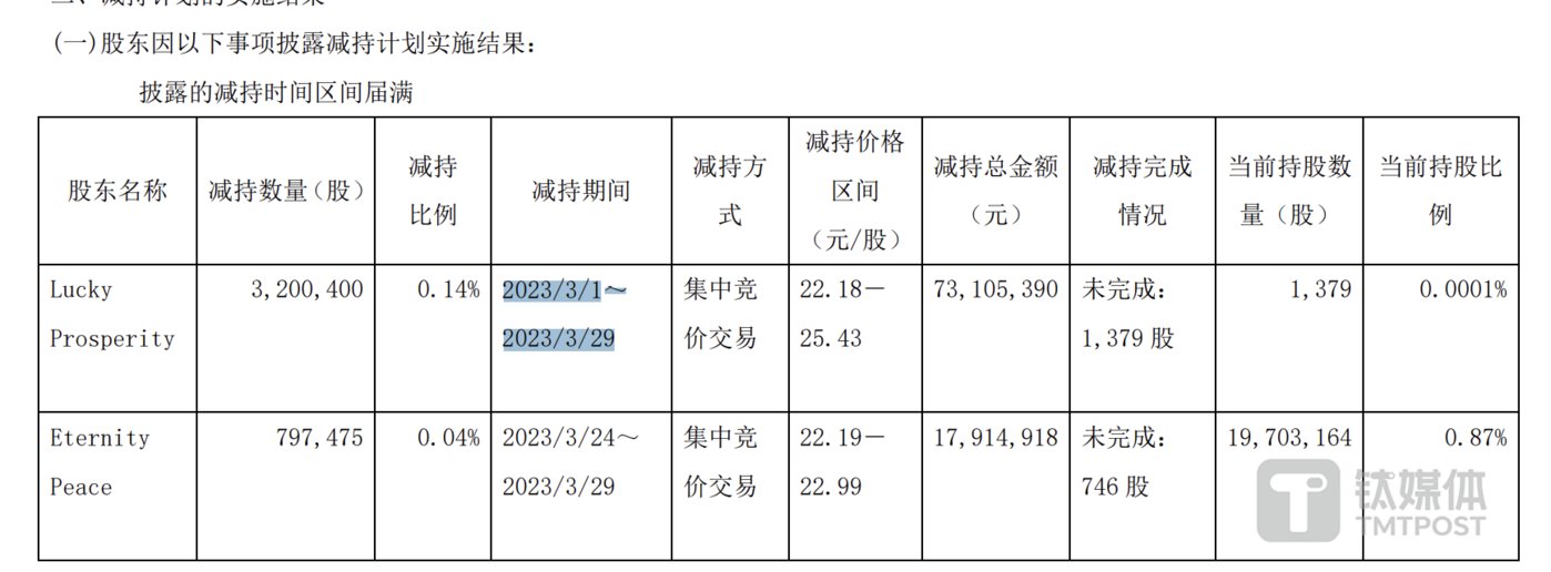 据公司2023年6月发布的股东减持股份结果公告显示,公司两名股东Lucky Prosperity Company Limited(下称Lucky Prosperity)和 Eternity Peace Company Limited(下称Eternity Peace)在2023年3月,分别减持公司320万股和79.75万股,分别套现7311万元和1791万元,合计套现9102万元。