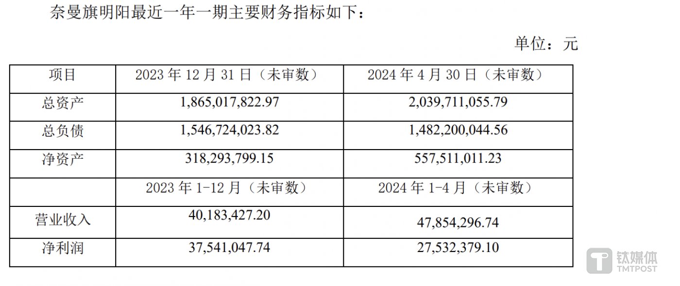 从业绩层面来看,2023年至2024年1-4月,奈曼旗明阳的营收分别为4018.34万元、4785.43万元,净利润分别为3754.1万元、2753.24万元,表现较为稳健。报告期内,开鲁明阳的营收分别为2.81亿元和8213.77万元,净利润分别为5681.61万元、-738.53万元。