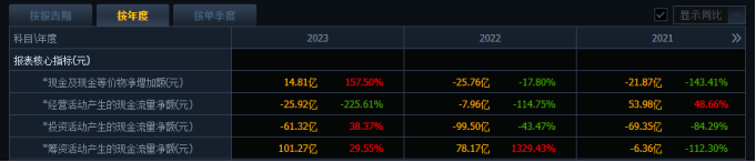 自2022年起,明阳智能经营活动产生的现金流量净额持续为负。2022-2023年及2024年一季度,公司经营活动产生的现金流量净额分别为-7.96亿元、-25.92亿元、-16.7亿元。2021年这一数值为53.98亿元。