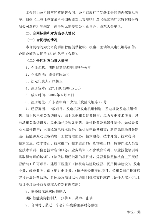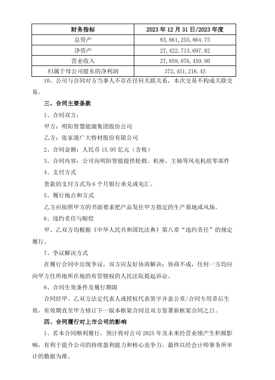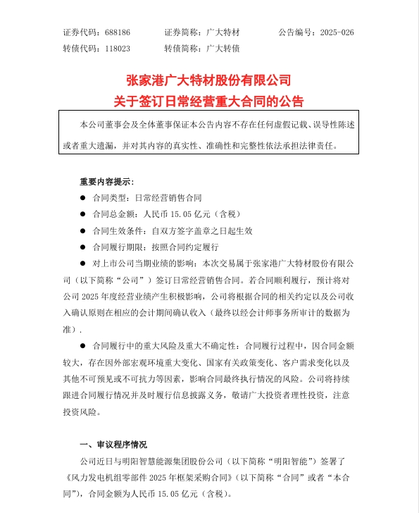 北极星风力发电网获悉,3月12日,张家港广大特材股份有限公司(简称:广大特材)发布关于签订日常经营重大合同的公告。公告显示,广大特材近日与明阳智能签署了《风力发电机组零部件2025年框架采购合同》,合同金额为人民币15.05亿元(含税),合同标的为广大特材向明阳智能提供轮毂、机座、主轴等风电机组零部件。