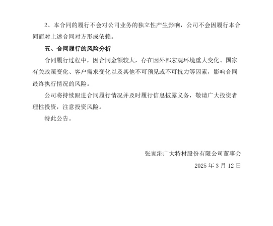 广大特材表示,若本合同顺利履行,预计将对公司2025年及未来经营业绩产生积极影响,有利于提升公司的持续盈利能力和核心竞争力。