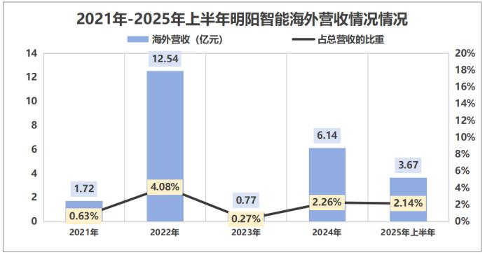 理想丰满,现实却仍显骨感。尽管“出海”战略在2022年的年报中就已明确提出,但国际化成果的兑现需要时间。根据2025年半年报,明阳智能的海外营业收入仅为3.67亿元,占总营收的比重仅为2.14%。