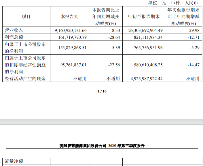 中国经济网北京10月31日讯明阳智能(601615.SZ)昨晚披露2025年三季度报告显示,今年前三季度,公司实现营业收入263.04亿元,同比增长29.98%;归属于上市公司股东的净利润7.66亿元,同比下降5.29%;归属于上市公司股东的扣除非经常性损益的净利润5.80亿元,同比下降14.47%;经营活动产生的现金流量净额为-49.26亿元。