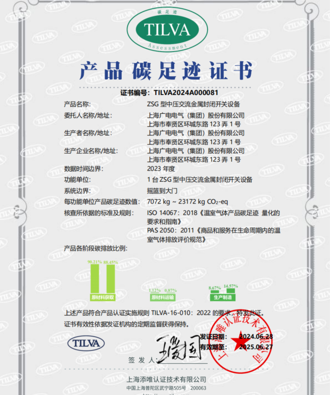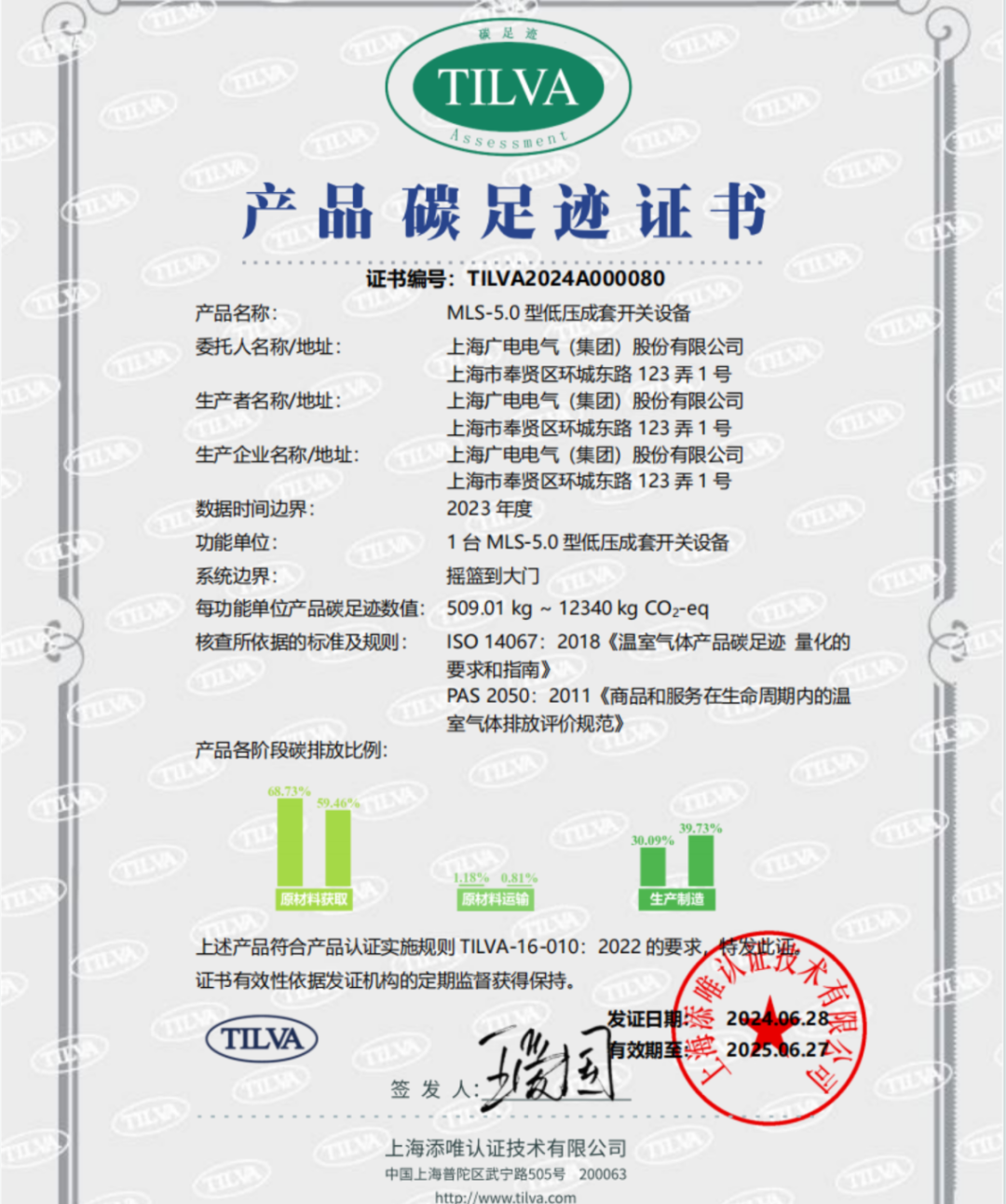 绿色理念同步延伸至产品研发与供应链协同。企业已完成MLS系列低压开关设备、ZSG系列中压开关设备、树脂绝缘干式电力变压器等核心产品的碳足迹核算与认证,将生态设计融入产品全生命周期。在供应链端, 广电电气 逐步构建供应商碳绩效评估体系,依托奕碳碳管理平台开展供应链碳数据采集与减碳协同,带动产业链整体向绿色化、低碳化方向演进。