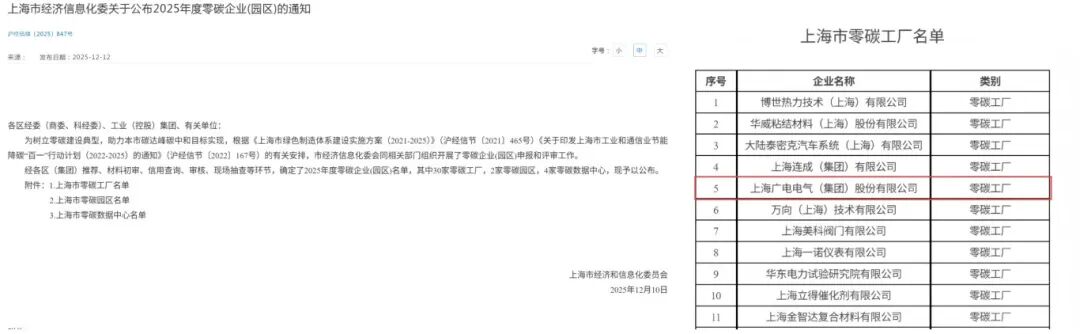 近日,上海 广电电气 (集团)股份有限公司凭借其在绿色制造与全链减碳方面的系统性实践,成功获评2025年度上海市“零碳工厂”,在已获评“绿色工厂”的基础上,进一步实现了“零碳工厂”认证, 广电电气 展现了在绿色低碳领域的积极探索与发展成果。
