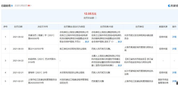 中国网财经梳理发现,今年6月上海宝冶集团因未采取有效防尘措施,被上海市青浦区城市管理行政执法局罚款人民币3万元。2月,因违反建设工程建设程序管理规定,被上海市松江区建设和管理委员会罚款1万元。同月,因未采取有效的防尘降尘措施,被长沙市望城区城市管理和综合执法局罚款2万元。