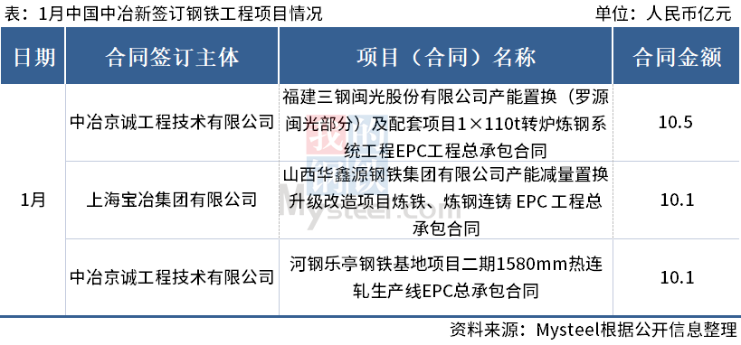 据中国中冶消息,2023年1月新签合同额人民币1054.2亿元,较上年同期降低4.3%。其中10亿元以上的重大钢铁相关工程承包合同3个,合同金额30.7亿元,具体项目明细如下:
