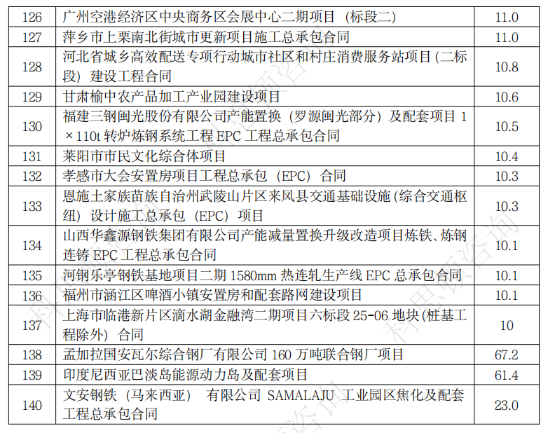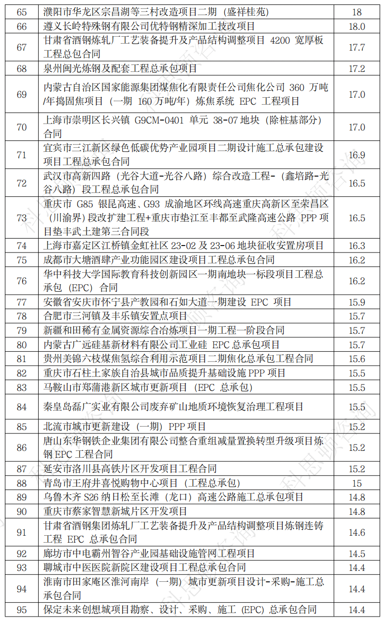 (注:中国五冶集团与上海宝冶集团合作17亿项目统计在中国五冶集团名下;中国一冶集团与中冶路桥建设有限公司合作15.9亿元项目统计在中国一冶集团名下)。