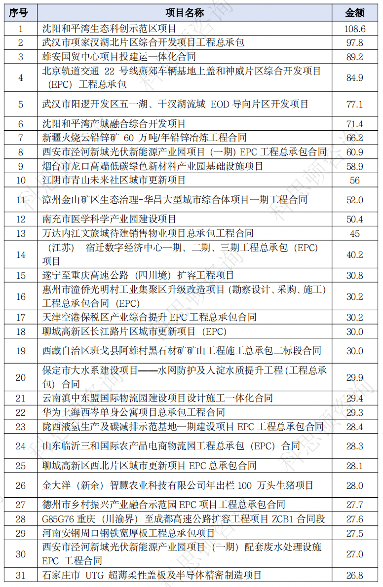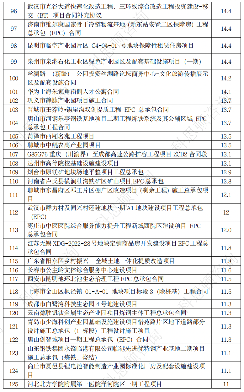 TOP3:中国二十二冶集团,累计签约金额达323.5亿元,其重大项目平均合同额为前五名中最高,达29.4亿元,其签署了中国中冶2023年唯一破百亿元项目,沈阳和平湾生态科创示范区项目;