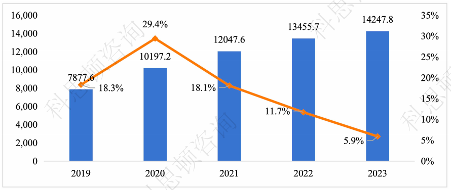 2019-2023年,中国中冶新签合同总额几乎实现了翻倍增长,由2019年的7877.6亿元上涨至14247.8亿元。2020年实现近30%的大幅增长,此后增长率逐年下滑,2023年增速下降至5.9%,增速放缓明显。