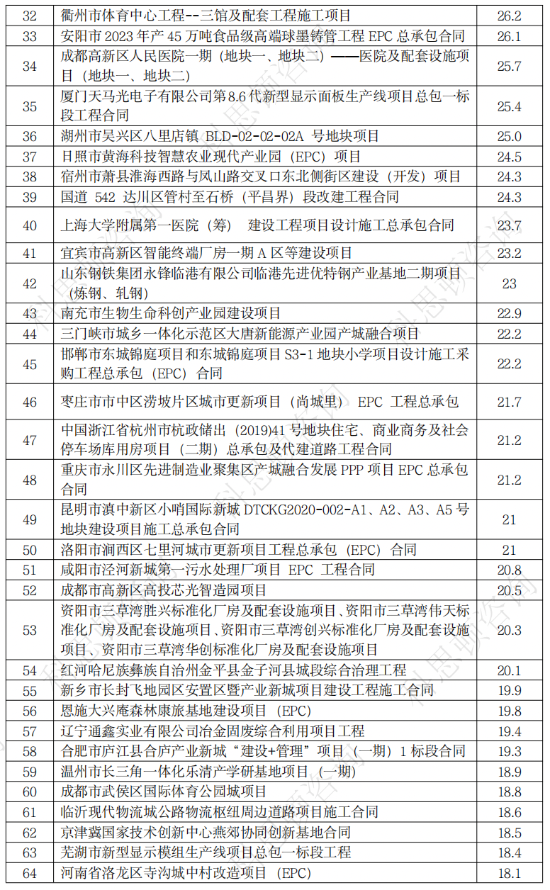 项目金额15-23亿元:共46个,除各类EPC项目、PPP项目及施工项目外,此梯队包含更多种类业务服务,如综合治理、冶金固废综合利用、工艺装备提升及产品结构调整、技改等;