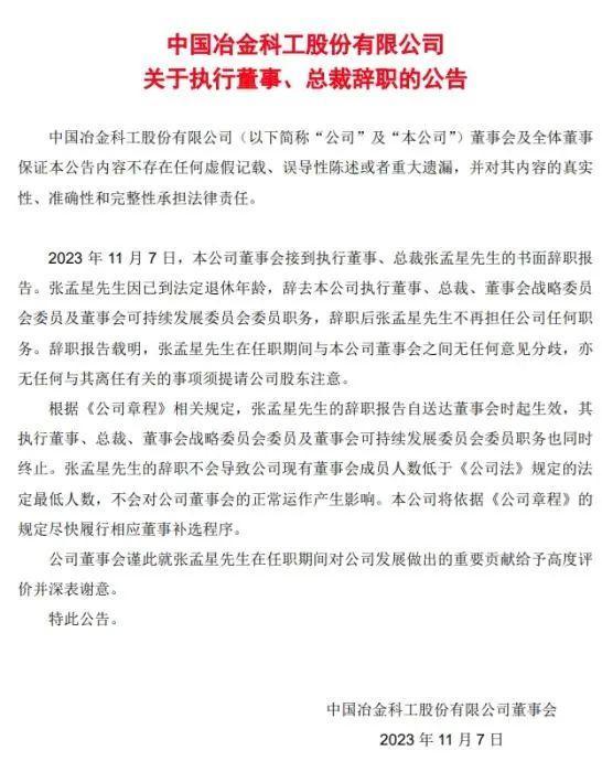 中国中冶公告显示,2023年11月7日,公司董事会接到执行董事、总裁张孟星的书面辞职报告。