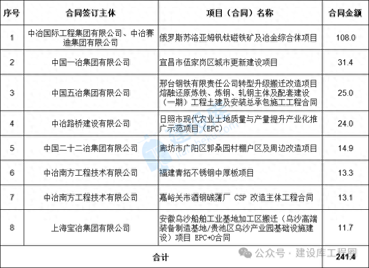 中国中冶于5月13日发布公告称:中国中冶 2024 年 1-4 月新签合同额人民币 4,108.9 亿元,较上年同期降低2.5%,其中新签海外合同额人民币 209.0 亿元,较上年同期增长 151.2%。